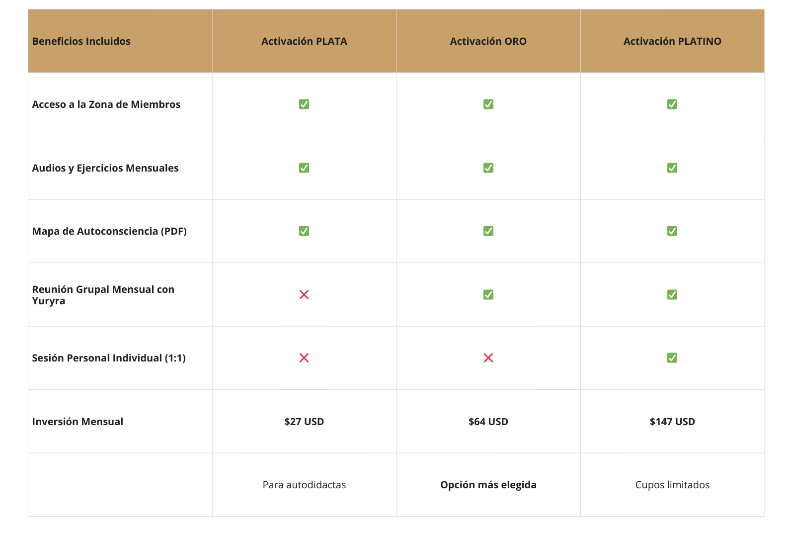 Al unirte a la lista de espera, tendrás prioridad para elegir los planes Oro y Platino antes de que los cupos se agoten, además de recibir una oferta especial de bienvenida que solo estará disponible para las primeras inscritas.